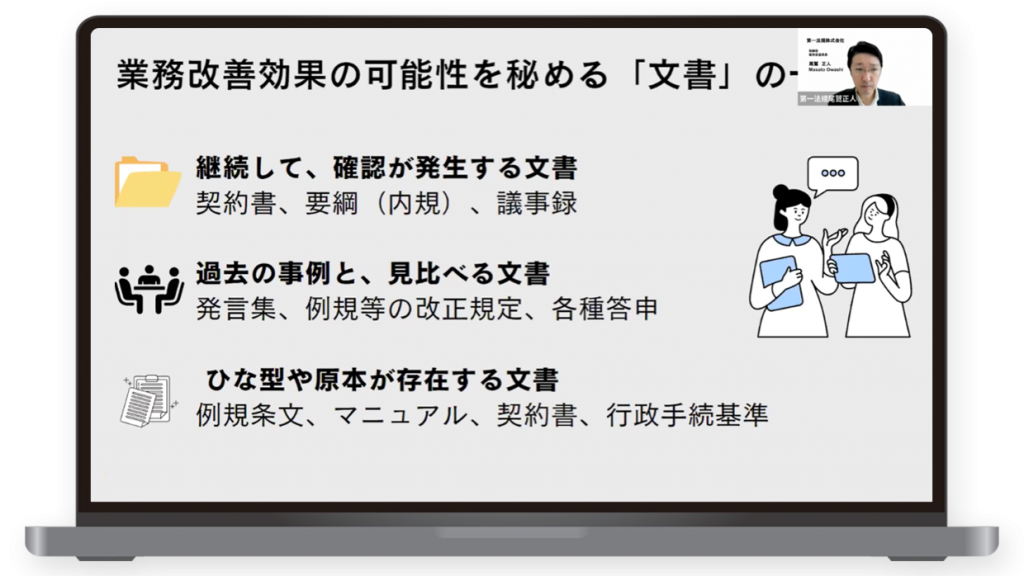 - 身近な文書から始める…取り組みやすく、業務改善効果の測定もしやすいです。