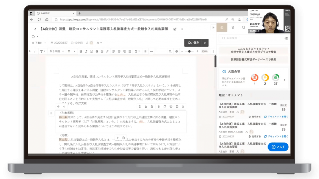 例えば、参考文例をパッと見つけたり、体裁をシステムが自動で直したり、さらに、過去履歴の蓄積も実現でき、企業様や士業様を中心に広くお使いいただいています。昨今では経済産業省・防衛省といった中央省庁の実証実験に採択され、尼崎市役所様や徳島県庁様など自治体様で導入された実績もあります。