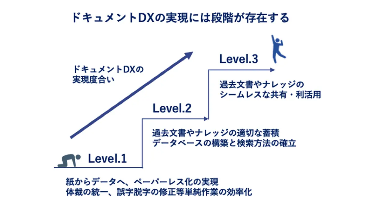 ドキュメントDXが実現されると、具体的に文書関連業務はどう変わるのでしょうか?実は、ドキュメントDXを進め、業務を変革していくには、段階を理解することが重要です。