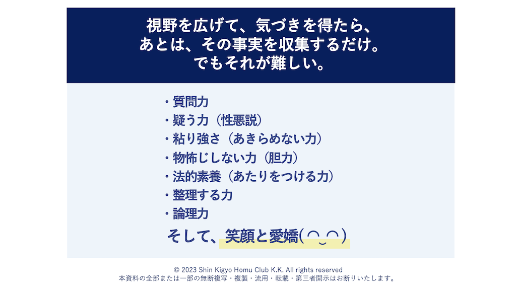 「視野を広げる」と一言で言っても、色々な要素がありましたが、最後は「笑顔と愛嬌」と書いてみました。特に社内で大切な要素ですね。法務って、基本的には社内で煙たがられる存在であることは重々ご承知だと思います。だからこそ、笑顔と愛嬌を持って関係者に接するということはとても大事かな、と自戒を込めて申し上げておきたいと思います。私の説明はここで終わりたいと思います。