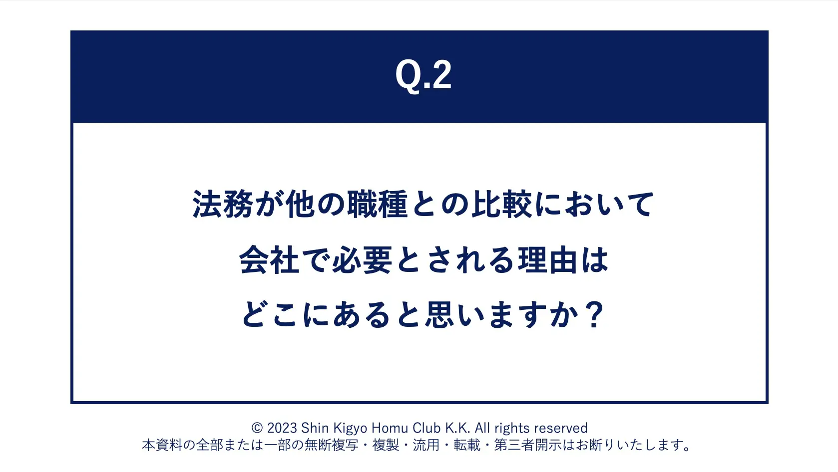 登島:皆さんそれぞれ所属している業界や会社によって、求められる役割が少しずつ違うと思います。そうした中でも、共通している存在理由というのは、「企業法務パーソンとしての思考回路を回せる人間であること」なんですね。