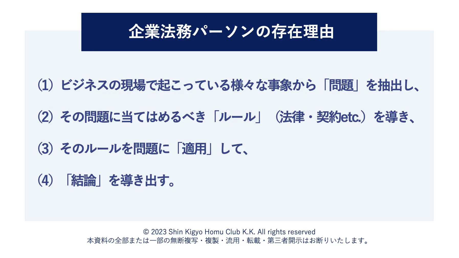 では、この「思考回路」がどんなものかというと、まずはビジネスの現場で起こっている様々な事象から問題・イシューを抽出できること。次に、その問題に当てはめるべきルールを導けること。これは法律、政令、告示、あるいはお客さん、ベンダーさんとの契約、会社のポリシーや社内規則である場合もあるでしょう。さらに3つ目として、目の前の問題に導いてきたルールを当てはめる=適用できること。そして最後に結論を導出できること。この一連の思考を回せることが、まさに企業法務に求められていることだと思っています。