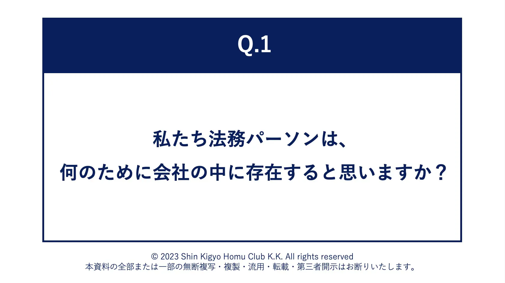 友澤:早速ですが、皆さんに「私たち法務パーソンは、何のために会社の中に存在すると思いますか?」という問いを投げかけたいと思います。