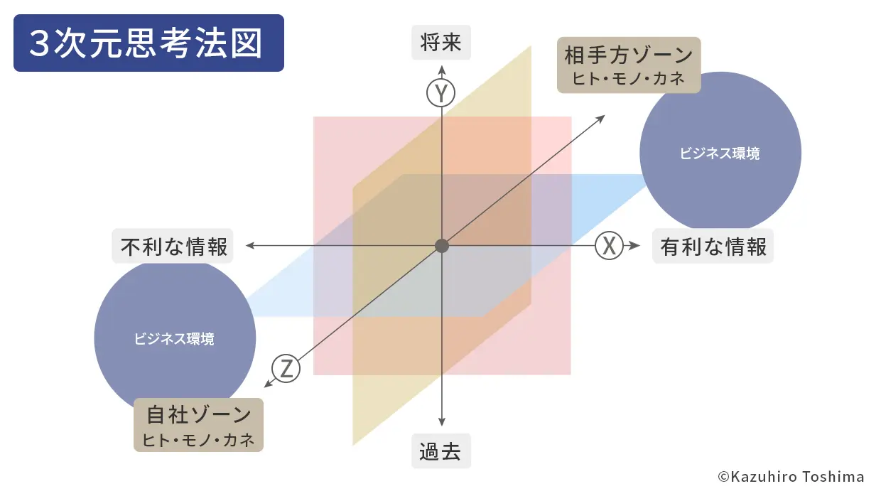 次にz軸ですが、手前側が自社ゾーンで向こう側が相手方ゾーンです。相手を見ると言っても、交渉相手しか見ていないというケースがよくあったりするわけですが、その相手には当然上司がいるし、さらには関係している法務以外の経理、人事、製造など色々な人がいるわけですよね。自社側も当然同じです。自社側にしても相手方にしても、ヒト・モノ・カネの動きがどうなっているのかな?という観点で見ることが大切です。