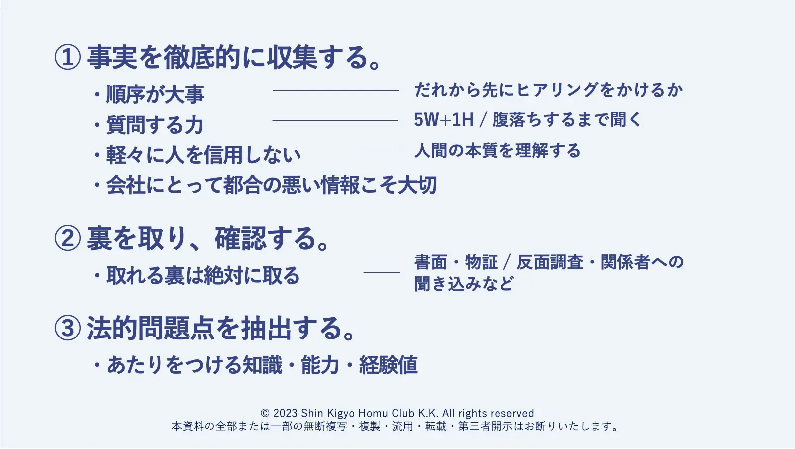登島:細かいことを言うと、「誰からヒアリングするのか」という順番や質問力は本当に大切なので、綿密にやる必要があります。事実確認にあたっては、5W1Hで一つひとつ聞かないといけないんですよね。これを整理しながら聞いていくと、同じことについて何回も聞くことも出てくるわけですよ。相手にとってはしつこく感じられるのですが、あえてそこを突破していかないと、法務としての仕事はできません。納得いくまできちんと聞くことですね。