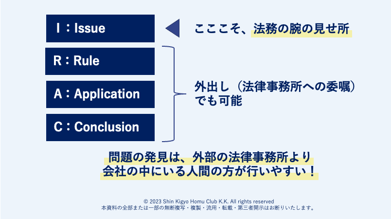 登島:ということで、IRACについて解説してきましたが、この中でもIssueこそ企業法務の腕の見せ所です。会社に関する基本的なナレッジや経験値は、外の弁護士事務所の先生方よりも企業法務の方が持っているはずで、組織内の人間関係まで含めて精度高くIssueを掘り出すのは、一枚上手であるはずですよね。
