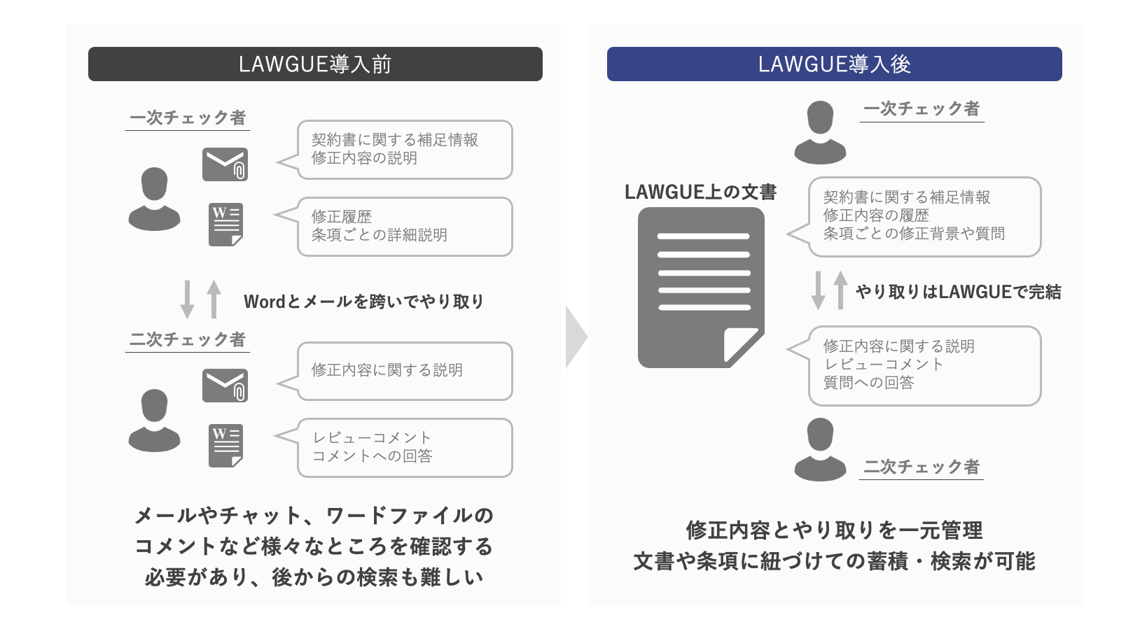 自社内のレビューはもちろん、交渉先の企業様からのコメントもLAWGUEに取り込んで一元管理できるので、やり取りの中で生まれるナレッジの蓄積・管理には非常に有効です。