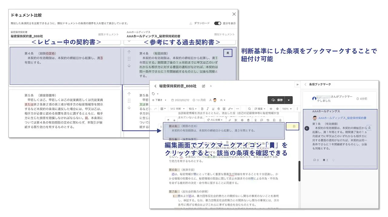 また、条項単位で参考にした過去契約書とレビュー中の契約書を紐付けられるため、一次チェック→二次チェックなど複数名で契約書を確認する際も、判断基準を一目で確認できます。