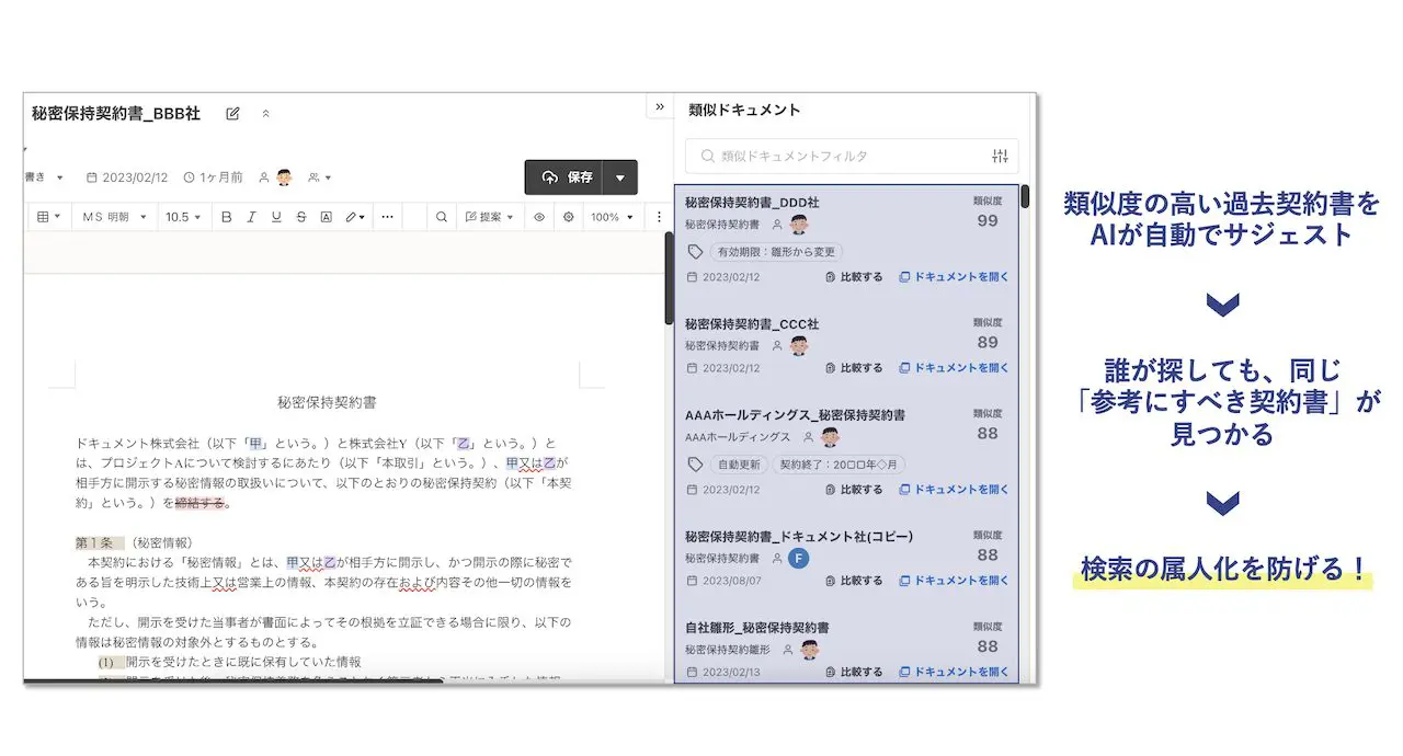 - 新人でもベテランでも、参考にしやすい似た契約書を簡単に見つけられるように
