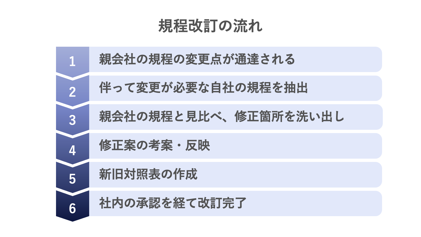 具体的には、まず親会社から変更がある規程の新旧対照表が共有されます。それを元に、自社のどの規程に変更を加える必要があるのかを選定。