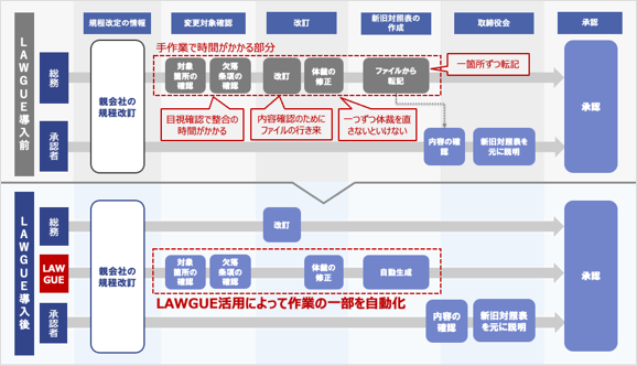 本来であればすべての規程が頭に入っていて、親会社の変更点をみて「あれとあれを変更すればいいのだな」と一瞬で理解できればいいのでしょうが、現実的には難しいです。LAWGUEの場合、新旧対照表を作成すれば変更点をはじめに理解でき、全体の大まかな作業量を簡単に把握できるため、スケジュールの見通しが立てやすくなりました。