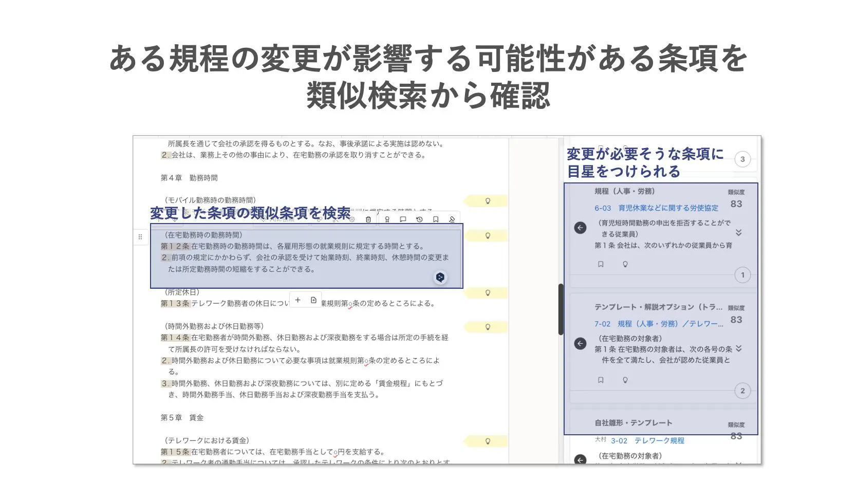 - 変更した条項について類似の条項を検索をすることで、影響する別規程の条項も抽出