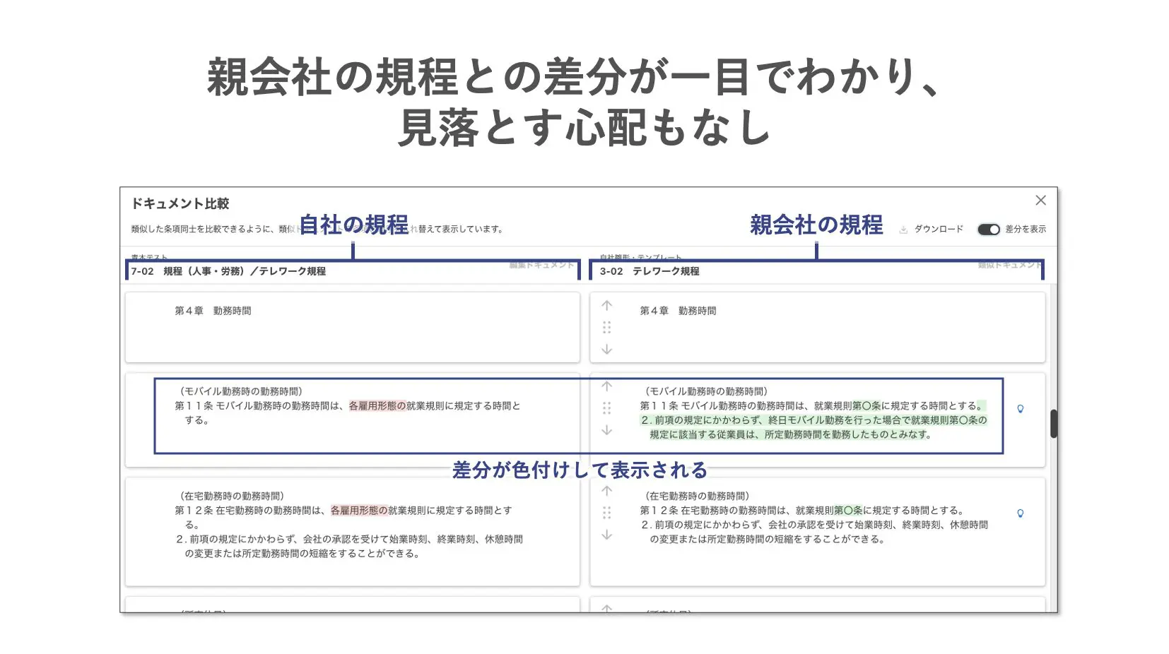 - 規程を改訂する際、親会社の規程と自社の現行規程を人の目で見比べるのに労力がかかる