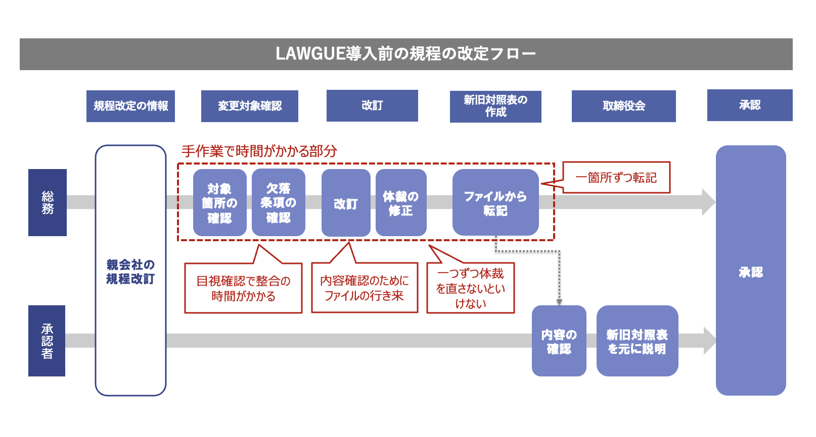 親会社の規程が改訂された際、自社の規程のどの部分に影響が出るのかを洗い出したり、親会社の規程との整合性を担保しつつ自社の業務実態に合わせて改訂したりと、参照すべき文書量や考えるべきことが多く、規程改訂の負荷が高い状況にありました。