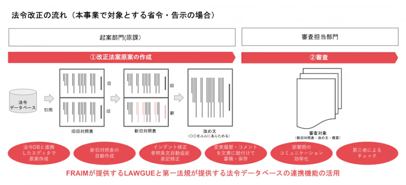 FRAIMは、資本業務提携先の第一法規と共同で、法令データベースと連携した文書作成支援サービスの開発を行っております。本事業での効果検証を踏まえて、他中央省庁や地方自治体に対し、当該サービスを活用した文書業務の抜本的な改善をご提案してまいります。