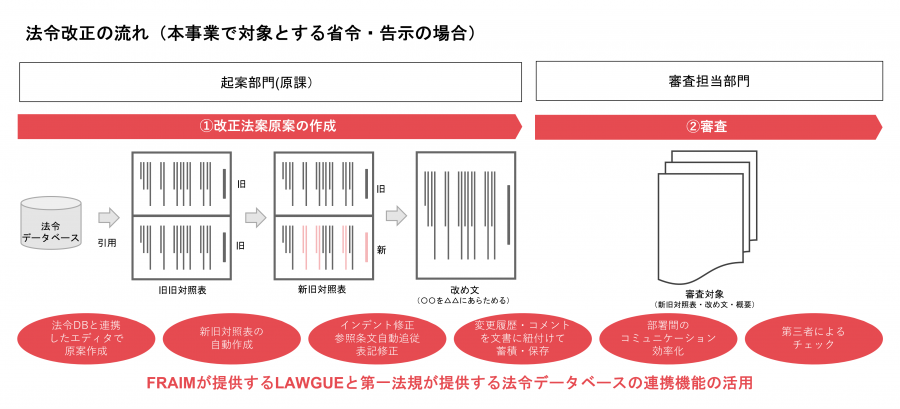 FRAIMは、資本業務提携先の第一法規と共同で、法令データベースと連携した文書作成支援サービスの開発を行っております。本事業での効果検証を踏まえて、他中央省庁や地方自治体に対し、当該サービスを活用した文書業務の抜本的な改善をご提案してまいります。