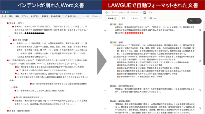 これにより、インデントやスペース、タブなどが混在し、インデントがずれている文書の自動フォーマットができるようになりました。典型的な条項号パターンとは異なる契約書や規程文書、その他あらゆるパターンの構造化文書(ナンバリングで階層化されている文書)に対するインデントの自動補正を実現しました。