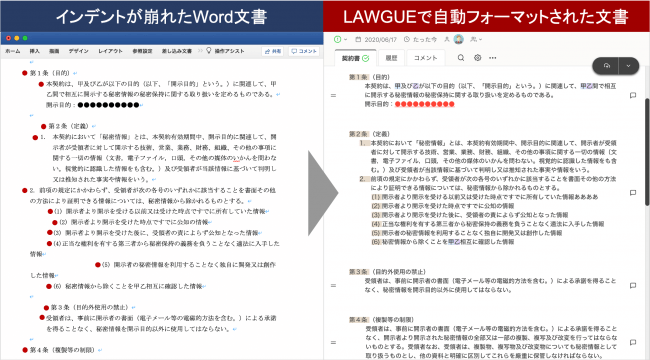 これにより、インデントやスペース、タブなどが混在し、インデントがずれている文書の自動フォーマットができるようになりました。典型的な条項号パターンとは異なる契約書や規程文書、その他あらゆるパターンの構造化文書(ナンバリングで階層化されている文書)に対するインデントの自動補正を実現しました。