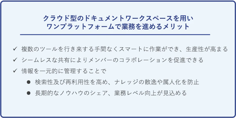 これにより、複数のツールを使わずに効率的に作業ができ、コラボレーションが促進され、情報の検索性と再利用性が向上します。また、ナレッジの散逸や属人化も防止でき、長期的なノウハウのシェア、業務レベル向上等の効果も見込むことができます。