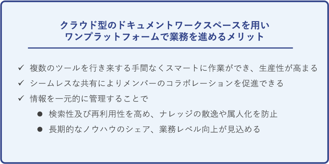 これにより、複数のツールを使わずに効率的に作業ができ、コラボレーションが促進され、情報の検索性と再利用性が向上します。また、ナレッジの散逸や属人化も防止でき、長期的なノウハウのシェア、業務レベル向上等の効果も見込むことができます。