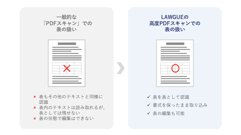 次世代クラウドAIエディタ「LAWGUE」が高度PDFスキャンを強化し、PDF内の表の取り込みに対応。表の形式を維持したまま再利用も可能に