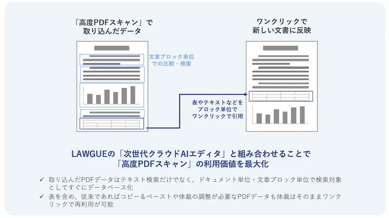 さらに、次世代クラウドAIエディタ「LAWGUE」の検索機能や文書をブロック単位に分割してデータベース化する特徴が組み合わせられることで、表を含めた様々な文書内の要素を簡単に検索、発見、再利用が可能となります。