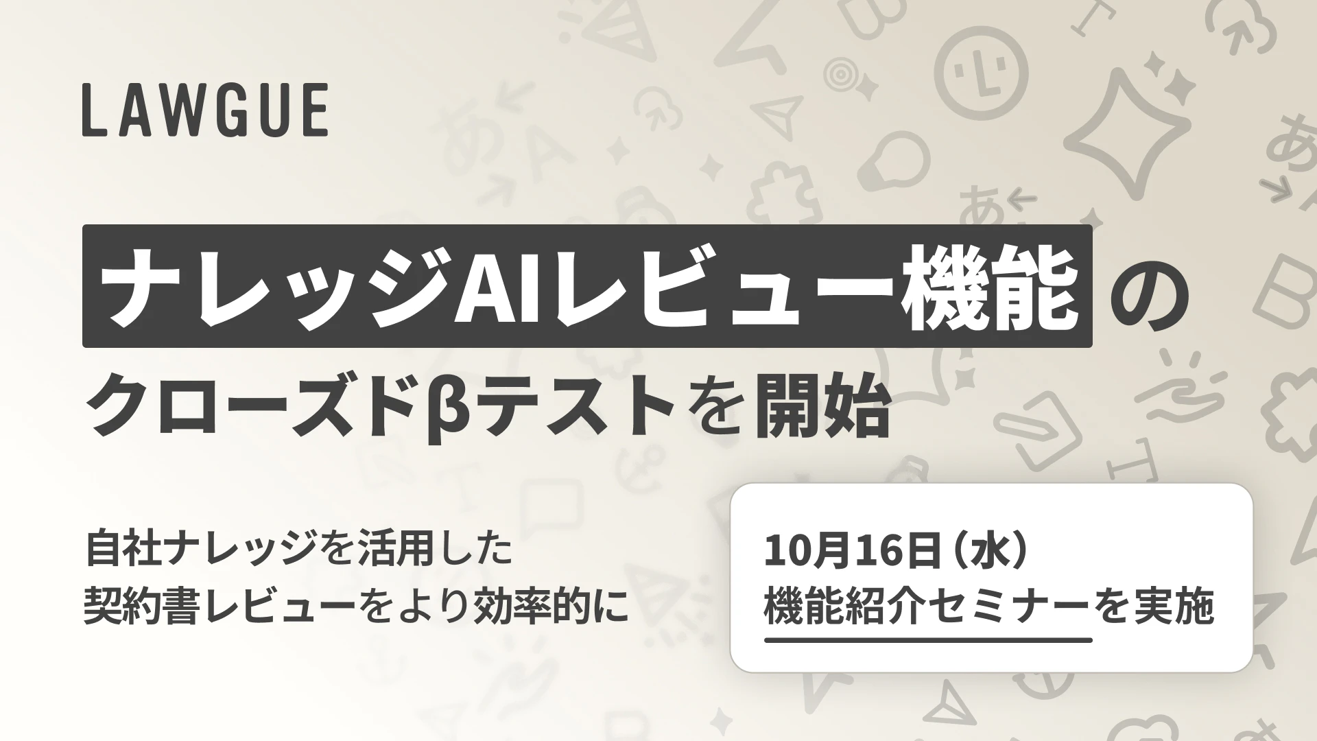 本件に関連し、10月からクローズドβテストが始まる「ナレッジAIレビュー機能」について紹介するセミナーを開催いたします。LAWGUEについてご存知ない方でもご理解いただける内容となりますので、ぜひご参加ください。