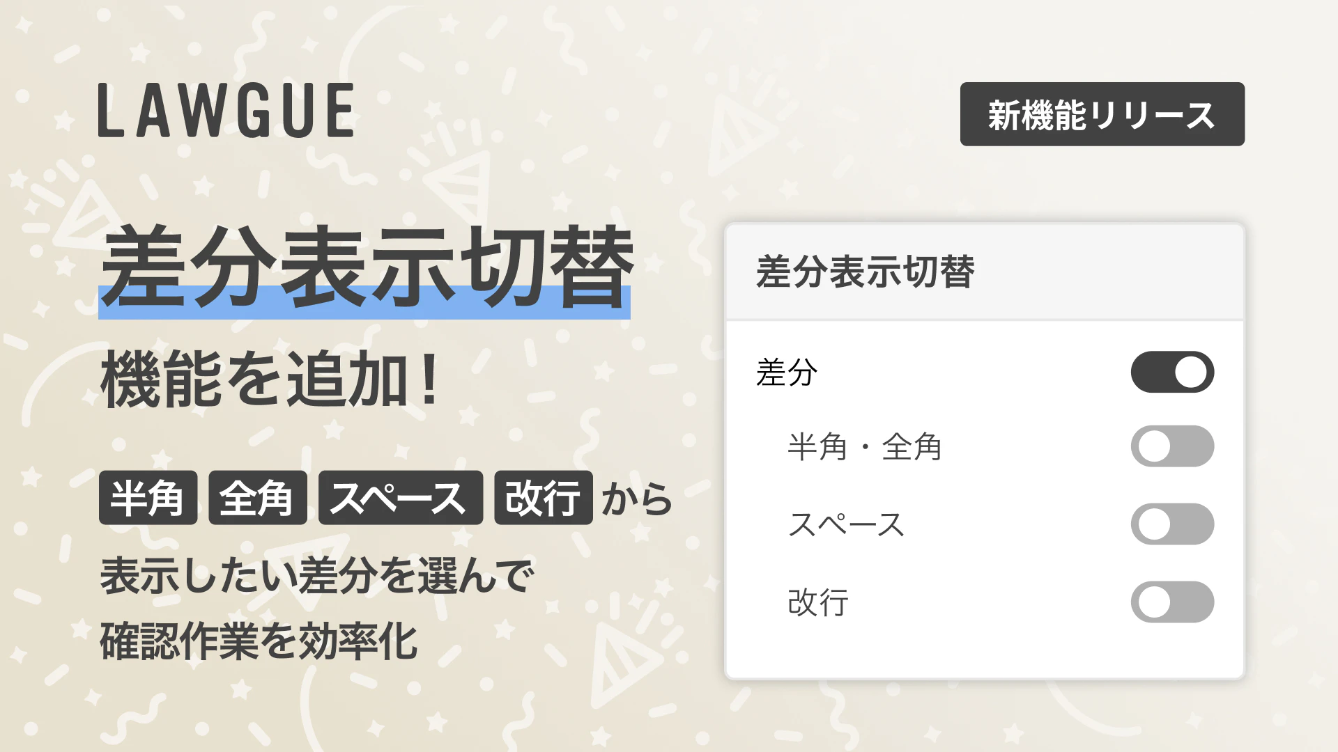 次世代AIクラウドエディタ「LAWGUE」、「差分表示切替」機能を追加 〜「半角・全角」「スペース」「改行」から表示したい差分を選んで確認作業を効率化〜