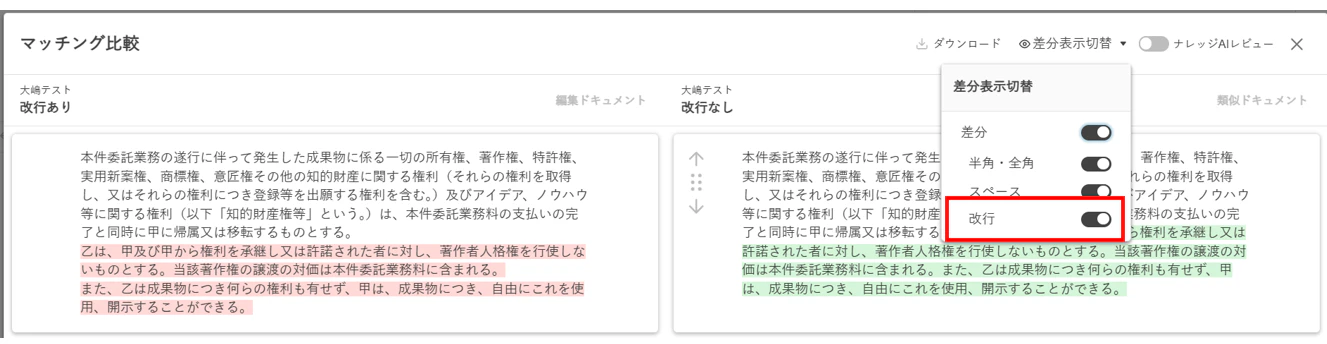・デフォルトの状態では「半角・全角」「スペース」「改行」が全て「ON」の状態(内容差分とともにハイライト表示される)