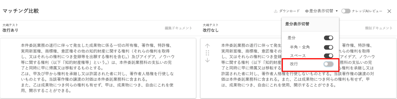 「LAWGUE」の差分表示では、これまでドキュメント内の全差分を検知し、ハイライトされる仕様となっていました。文章の内容に関する差分チェックに集中したいシーンでは、改行や半角・全角の違いなどの形式的な部分までも差分として可視化されてしまうと、効率よく確認作業を進める妨げになる場合があります。今回の「差分表示切替」機能の追加により、「半角・全角」「スペース」「改行」の検知を任意で選択でき、必要な差分だけを絞って確認できるようになります。