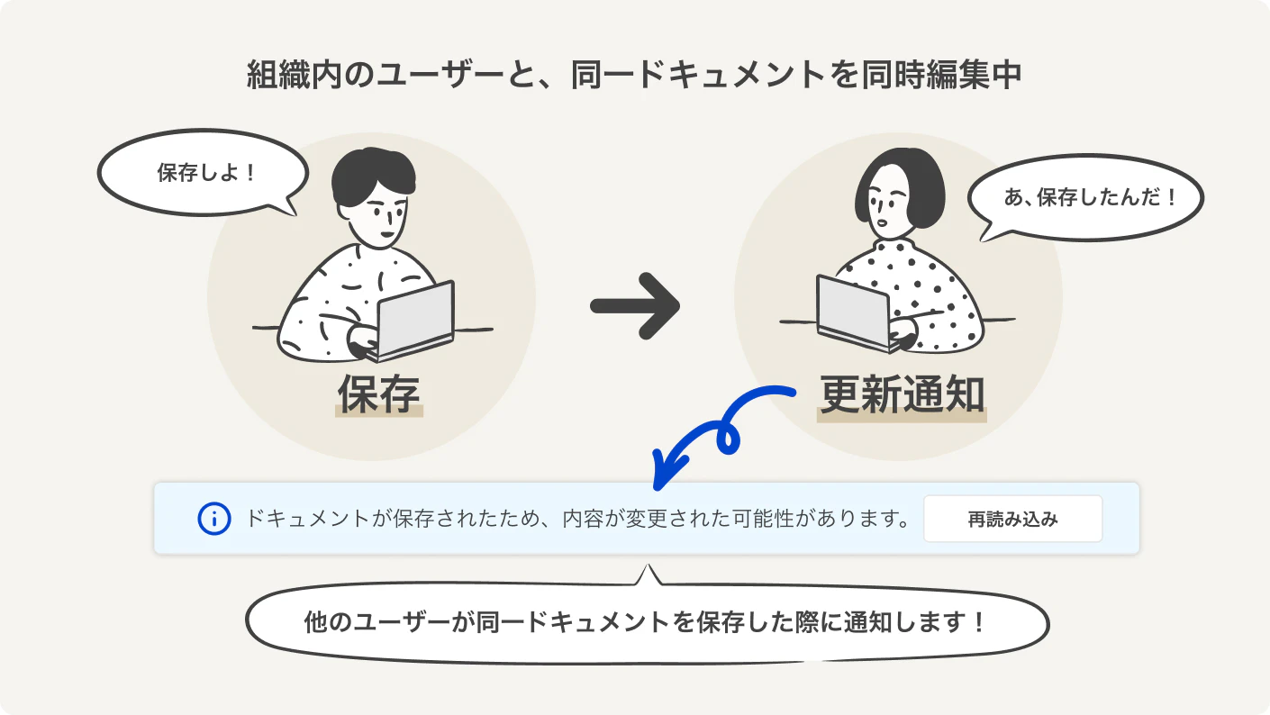他のユーザーによる保存や別タブでの保存によって、自身が開いているものより新しいバージョンが更新された際、「LAWGUE」画面の上部に通知バナーが表示されます。