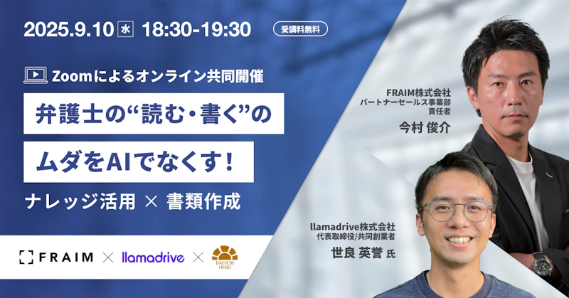これまで手作業で“探して”“読んで”、“書いていた”煩雑なプロセスを、一気通貫で、しかも誰でも使える直感的な操作で実現!法律実務における「読む(インプット)」「書く(アウトプット)」の両側面を、AIがどこまで効率化・自動化できるかを、実際の画面デモを交えながらわかりやすくご紹介します!