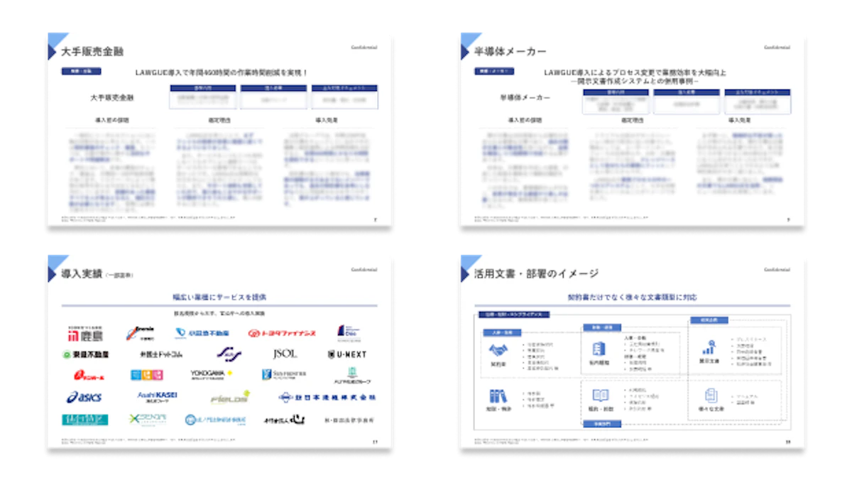 LAWGUEの導入事例を知りたい方向けへの資料です。様々な業種・規模の企業や法律事務所での導入事例をご紹介しています。