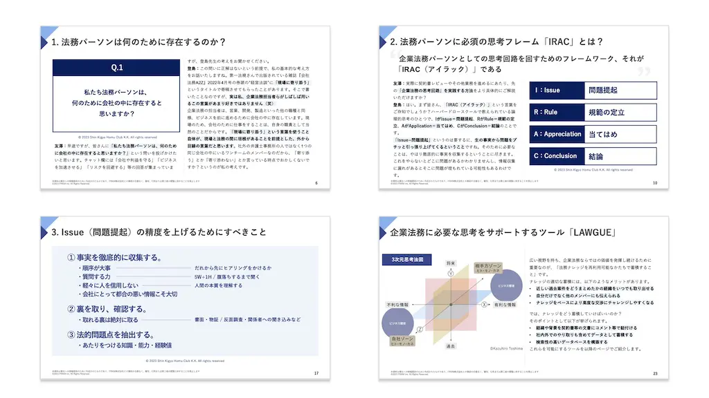 法務パーソンとしてキャリア30年以上の講師が語る、企業法務に必須の思考フレームワークやマインドセットをご理解いただけるレポートとなっております。ぜひご一読ください!