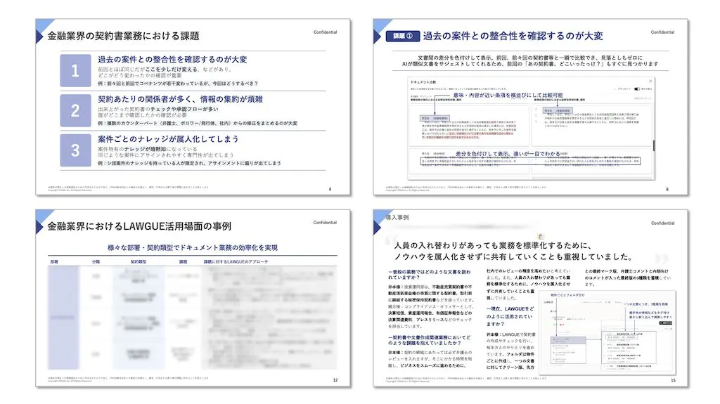 本資料は、金融業界の契約書業務における課題を解決できる方法をご紹介する資料です。契約書の作成やレビューにおいて手間がかかる業務を具体的に挙げながら、それらを効率化する方法をお伝えします。また、実際に銀行等の金融系企業のどのような部署において、どのような契約書で使われているのか等の具体的な事例もご紹介しています。