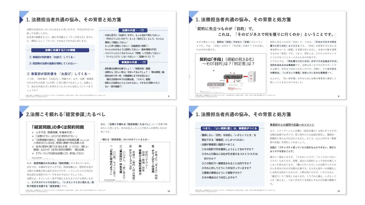 本資料では、数多くの企業法務や訴訟に携わってきた鳥山半六氏(弁護士・弁理士)が、多くの企業法務が遭遇する課題やそれらを解決していくための具体的な方法、さらには事業や経営に貢献する法務になるために重要なポイントをご紹介します。